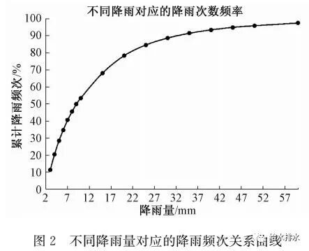 首先,需要分析城市和区域的年降雨特征,包括年际特征(年降雨情况、丰平枯年降雨量、降雨日数)变化和年内变化(月降雨情况)、日降雨特征包括年径流总量控制率与雨量对应关系(见图1)和降雨频次与雨量对应关系(见图2)。其中,不同重现期的长历时降雨和短历时降雨的雨型分析用于内涝分析和设计校核雨水管网规模,历史暴雨情况用于内涝分析和模型参数率定,典型年的分析用于年径流总量控制的分析计算和污染测算(面源计算、CSOs溢流计算等)、水资源配置方案的模拟分析。