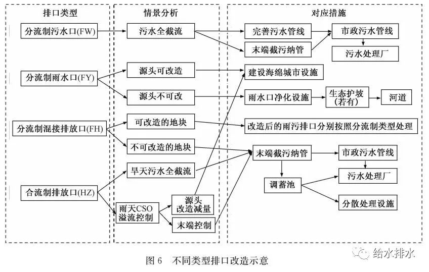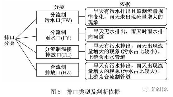 为了更好地编制方案,需要通过水质监测或者模型模拟计算分析水体水环境本底情况和环境容量,并计算何种污染物是造成水环境问题的主要污染物。水体黑臭在水里,但其根源在岸上,排水口的排放情况是导致水环境污染的最重要成因。所以,分析水环境问题,重点就是要对排口进行分析。通过图纸和现场详细踏勘,结合旱天和雨天排口的水量水质变化明确排水体制和排口类型(污水直排、雨水、合流制溢流、混接错接等,具体见图5),基于排口调查和计算明确排口的实际排放量和污染物排放情况。